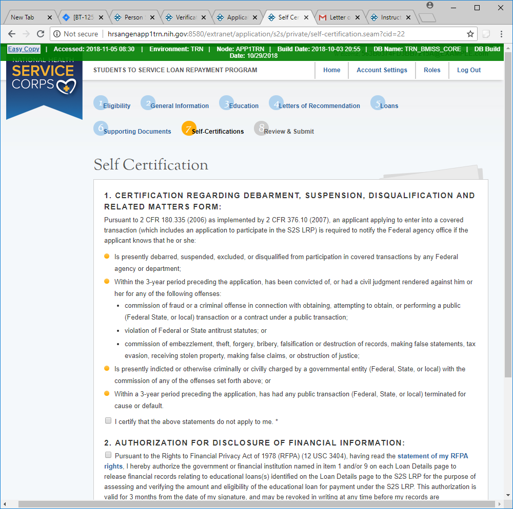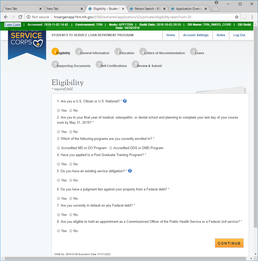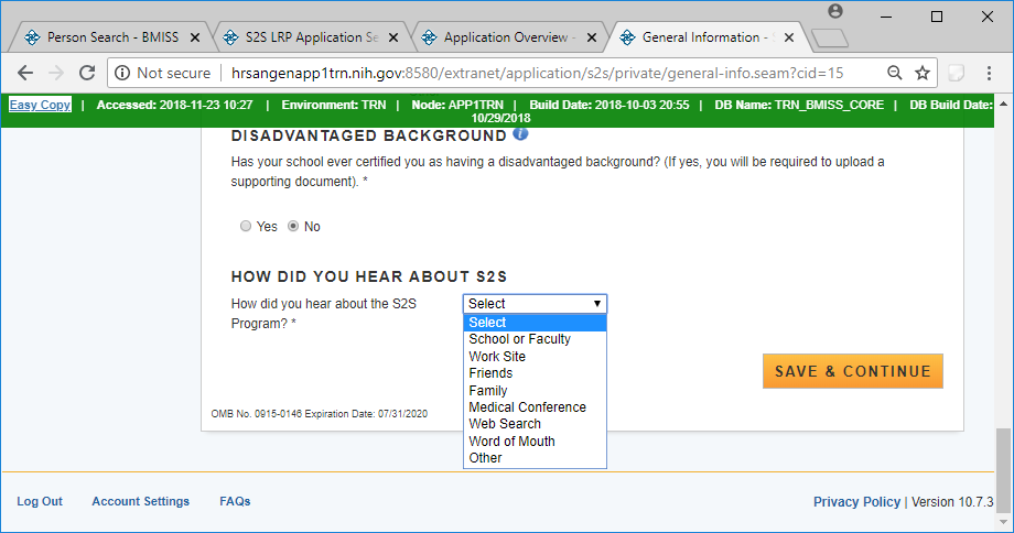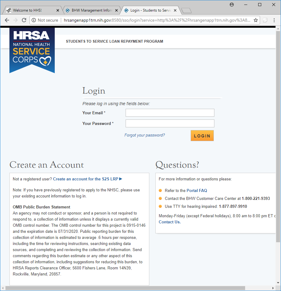 Public Burden Statement: The purpose of this information collection is to obtain information through the National Health Service Corps Students to Service Loan Repayment Program (NHSC S2S LRP) that is used to assess a loan repayment applicant’s eligibility and qualifications. Clinicians interested in participating in the NHSC S2S LRP must submit an application to the NHSC S2S LRP through the My BHW online portal. An agency may not conduct or sponsor, and a person is not required to respond to, a collection of information unless it displays a currently valid OMB control number. The OMB control number for this information collection is 0915-0146 and it is valid until xx/xx/xxxx. This information collection is required to obtain or retain a benefit [Section 338B of the Public Health Service Act (42 USC 254l-1), as amended; Section 331(i) of the Public Health Service Act (42 USC 254d(i)), as amended)]. The information is protected by the Privacy Act, but it may be disclosed outside the U.S. Department of Health and Human Services, as permitted by the Privacy Act and Freedom of Information Act, to Congress, the National Archives, and the Government Accountability Office, and pursuant to court order and various routine uses as described in the System of Record Notice 09-15-0037. Public reporting burden for this collection of information is estimated to average xx hours per response, including the time for reviewing instructions, searching existing data sources, and completing and reviewing the collection of information. Send comments regarding this burden estimate or any other aspect of this collection of information, including suggestions for reducing this burden, to HRSA Reports Clearance Officer, 5600 Fishers Lane, Room 14NWH04, Rockville, Maryland, 20857.