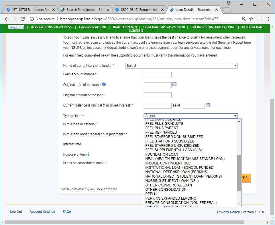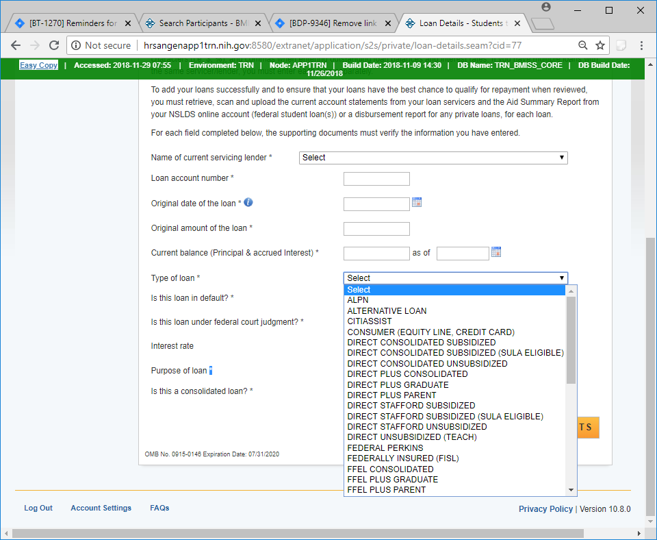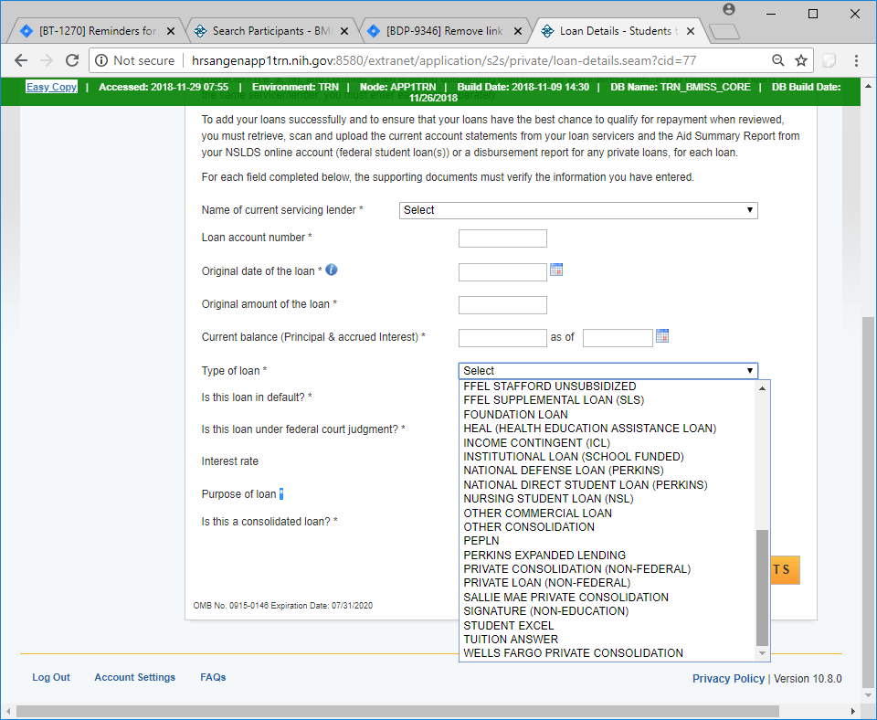 Drop down options for Type of Loan