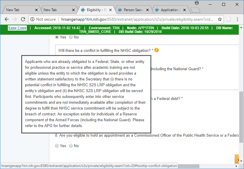 Section 1 Eligibility – Tool Tips and Drop Downs