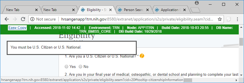 Applicants who respond “No” to “Are you a U.S. Citizen or U.S. National” will be ineligible