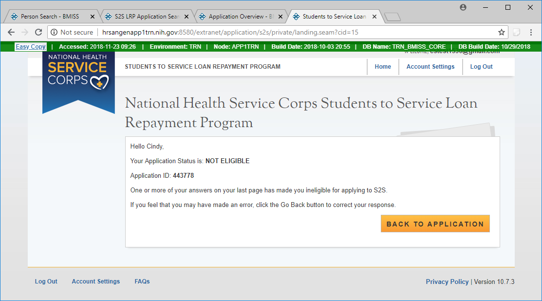 If an applicant is deemed ineligible based on their responses in section 1, the following screen will be displayed.