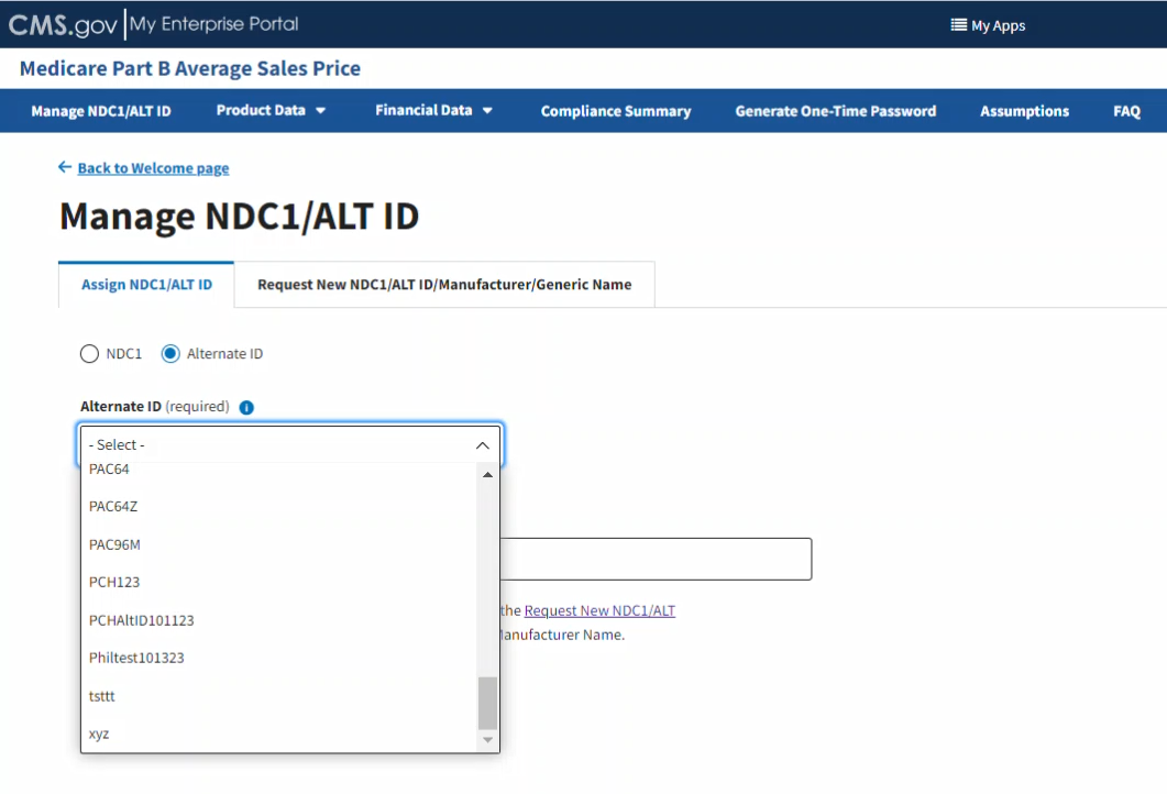 Figure 14: Manage NDC1/ALT ID Page - Assign ALT ID Drop-down Menu