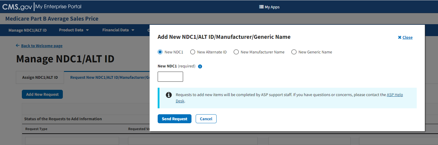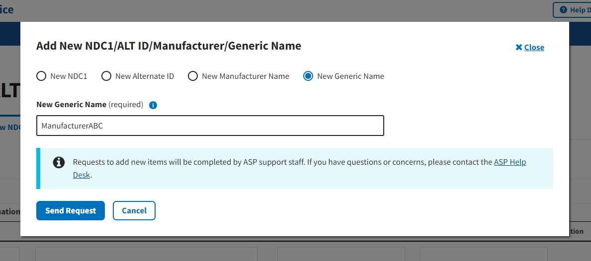 Figure 18: Request New NDC1/ALT ID/Manufacturer/Generic Name Page - Add New NDC1