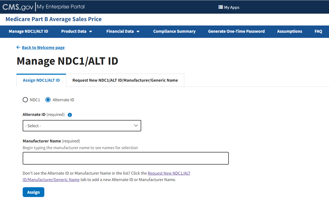 Navigate to the Manage NDC1/ALT ID page, which automatically opens on the Assign NDC1/ALT ID tab.