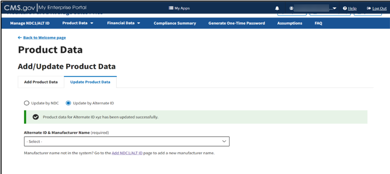 Figure 15: Manage NDC1/ALT ID Page - Enter ALT ID Manufacturer Name