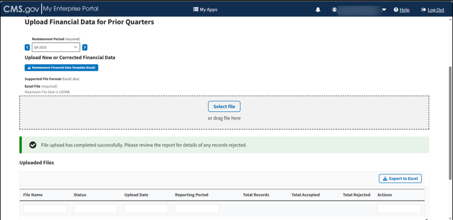 Figure 80: Upload Financial Data for Prior Quarters - New File Successfully Uploaded 56
