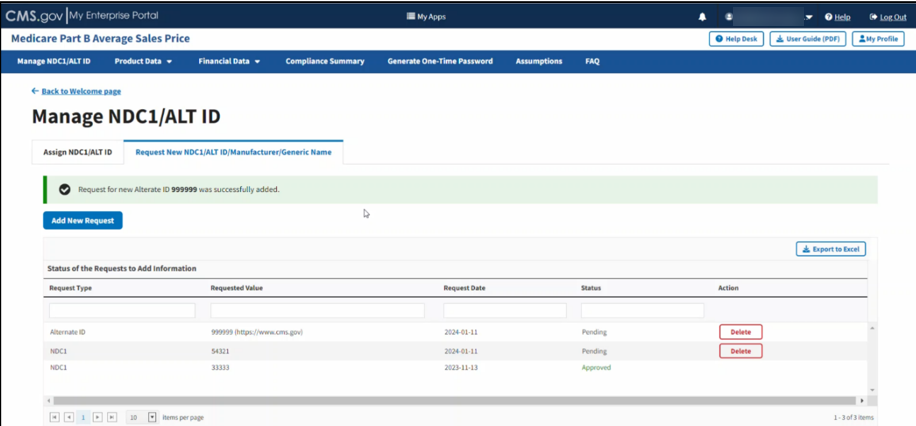 The Request New NDC1/ALT ID/Manufacturer/Generic Name page opens, showing the status (Pending, Approved, or Rejected) for each submitted request. The Module organizes data by Request Type, Requested Value as well as Request Date and Status (Pending, Approved, or Rejected). Refer to Figure 17.