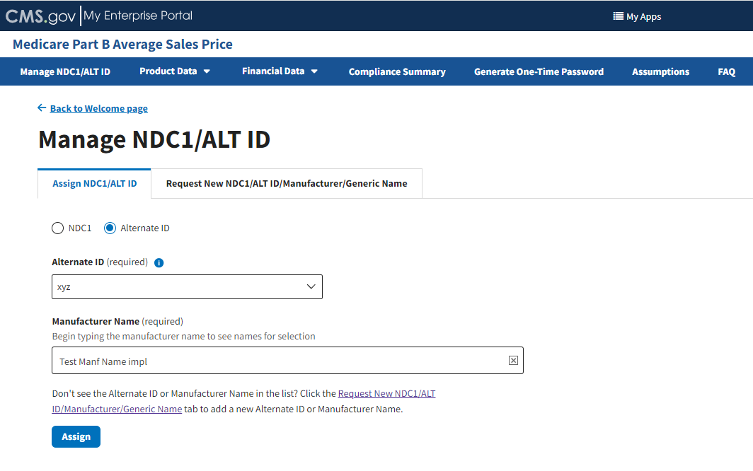 Figure 9: Manage NDC1/ALT ID Page - Assign NDC1