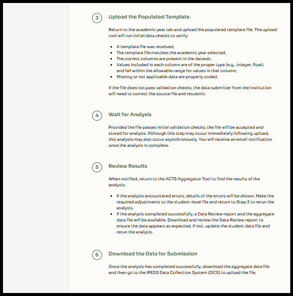 This web application allows users to securely process student-level data into aggregate datasets required for ACTS submission. Each tab in the student-level data collection file contains the student-level variables needed to perform the necessary calculations to create the aggregations required by ACTS, and the ACTS Aggregator Tool will perform these calculations. It supports consistency, accuracy, and efficiency in data handling while reducing the need for manual processing.