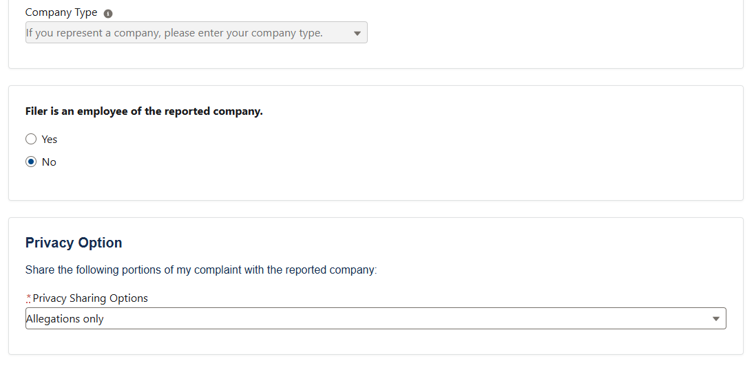 Option for the filer to have an individual submit a complaint on their behalf or mark that they wish to remain anonymous |